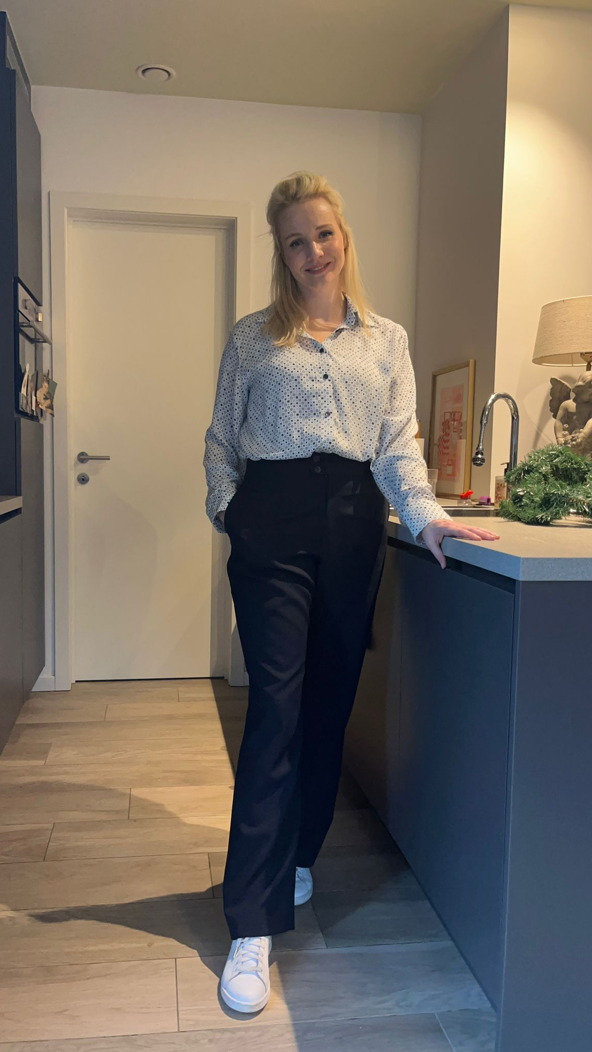 Roos, een blouse met aangeknipte sluiting, brede manchetten met op gestikte zakken, een kraag met staander en afgeronde zoom.